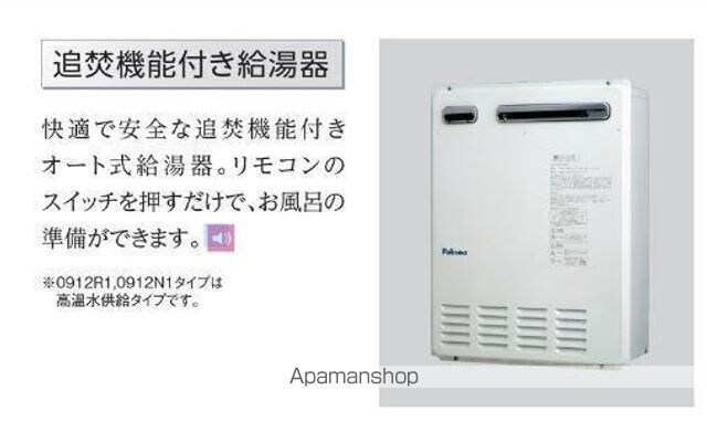 | 設備 | ガス:プロパン、バス・トイレ別、シャワー、コンロ:IH、追い焚き、洗髪洗面化粧台、冷暖房:完備、床下収納、ウォークインクローゼット、洗濯機置場:室内、BSアンテナ、宅配ボックス、駐輪場あり、TVドアホン、温水洗浄便座、浴室乾燥機 |