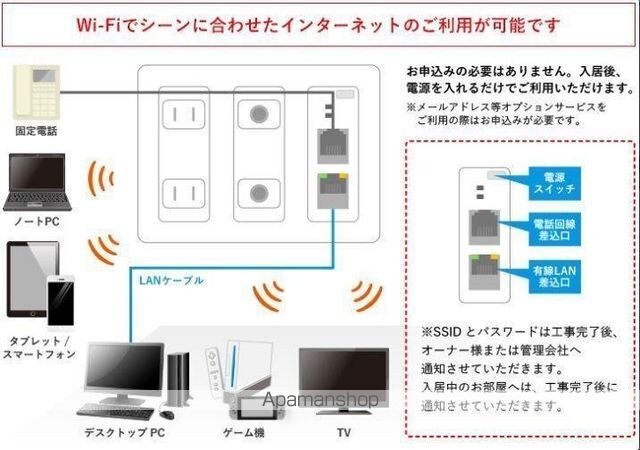 | 設備 | ガス:プロパン、バス・トイレ別、シャワー、コンロ:ガス、コンロの口数:2口、システムキッチン、給湯、追い焚き、洗髪洗面化粧台、冷暖房:完備、洗濯機置場:室内、BSアンテナ、フローリング、インターネット:光、TVドアホン、温水洗浄便座、複層ガラス、浴室乾燥機、独立洗面 |