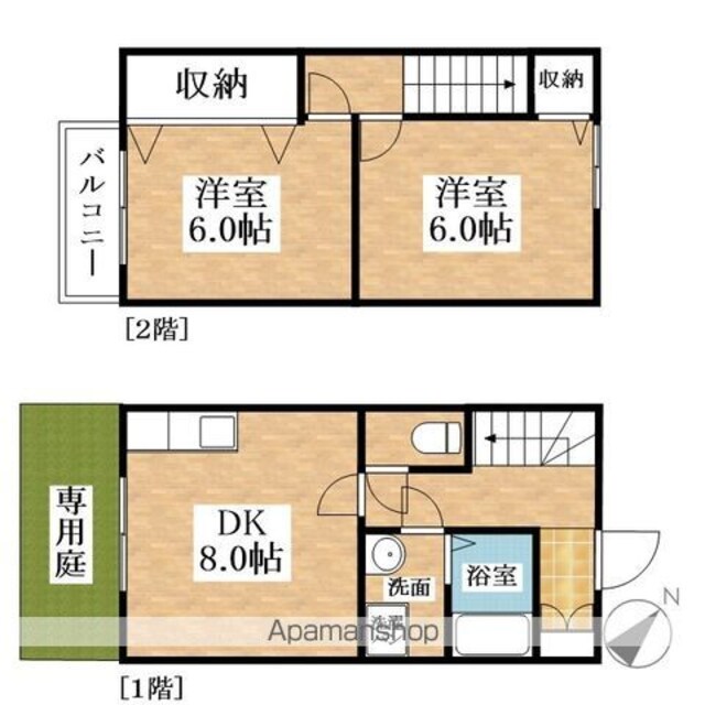 メゾネットタイプの中部屋となります。専用庭があるので物置きとしても利用できます。2階は2部屋に収納があり、荷物が多い方にも嬉しい。閑静な立地で、大通りに出れば周辺環境も賑わいがあります。