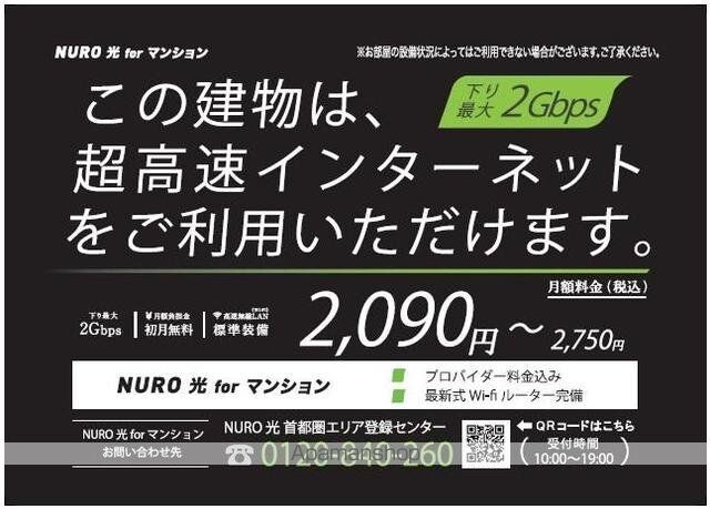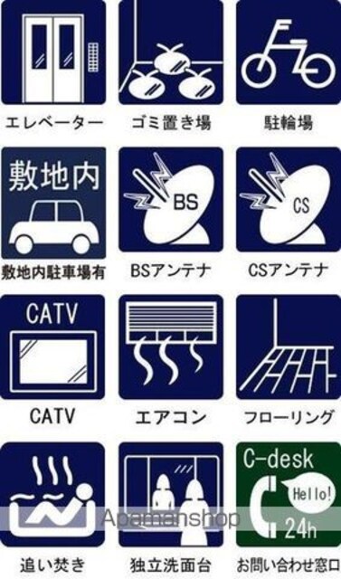 | 設備 | バス・トイレ別、シャワー、コンロ:ガス、コンロの口数:2口、システムキッチン、追い焚き、冷暖房:完備、洗濯機置場:室内、CATV、CSアンテナ、BSアンテナ、エレベータ、バルコニー、フローリング、駐輪場あり、インターネット:光、独立洗面 |