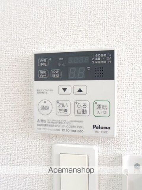| 設備 | ガス:プロパン、バス・トイレ別、シャワー、追い焚き、洗髪洗面化粧台、冷暖房:完備、洗濯機置場:室内、BSアンテナ、バルコニー、フローリング、駐輪場あり、TVドアホン、温水洗浄便座、複層ガラス、浴室乾燥機、独立洗面、照明器具 |