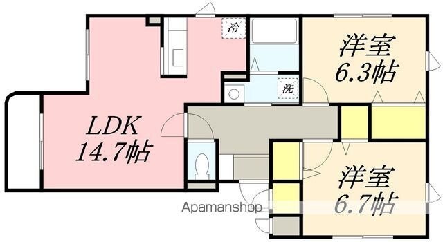 | 築年月 | 2002年08月 | 間取り | 2LDK (内訳:LDK14.7 洋6.7 洋6.3) |
