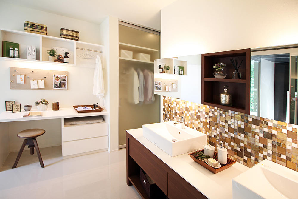 タイル貼りの床でリゾート感を漂わせるお洒落なサニタリーは、家事動線も配慮。