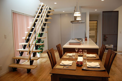 広さのヒミツは吹き抜けと段下がりのリビング。空間に広がりが生まれます。
