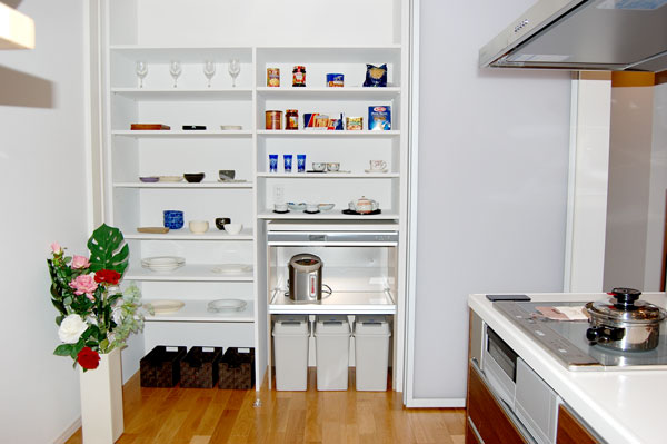 キッチンに標準装備の大容量収納。右の扉には冷蔵庫が格納できます。